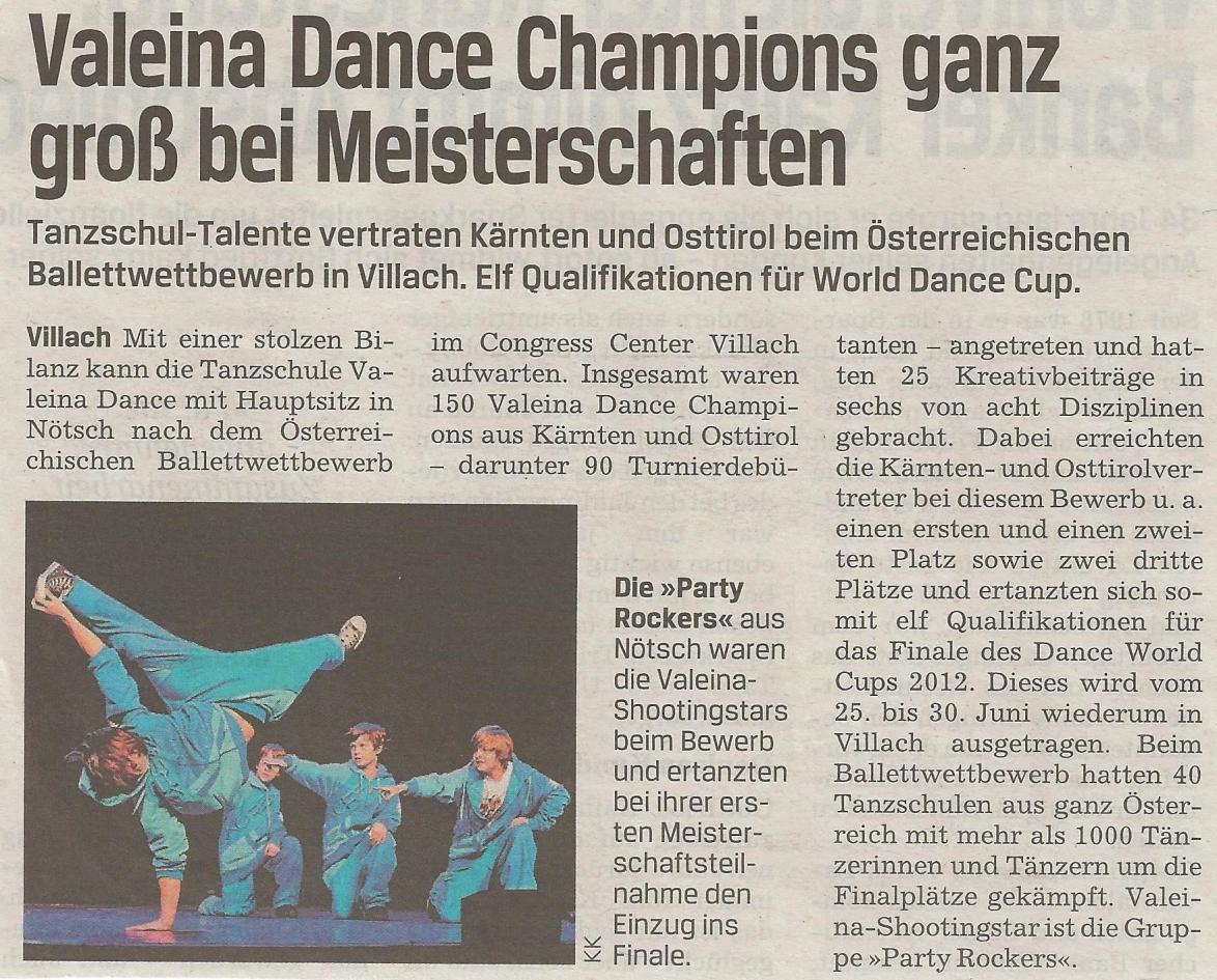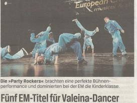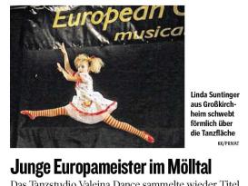 jährlich erscheinen rund 50 bis 80 Presseberichte über die Valeina Dance Group. Aktuelle, wie aber auch schon ältere Presseberichte über Tänzer/innen, Schulen, Aktivitäten und Erfolge der Valeina Dance Studios findest du in unserem Presse-Archiv.
